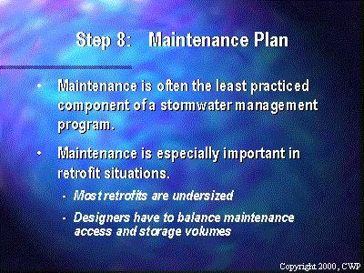 Always the last element to be discussed, and often the least practiced component of a stormwater management program, maintenance is doubly important in retrofit situations. The reasons are simple. Most retrofits are undersized when compared to their new development counterparts and space is at a premium in urban areas where many maintenance provisions such as access roads, stockpiling or staging areas are either absent or woefully undersized.
