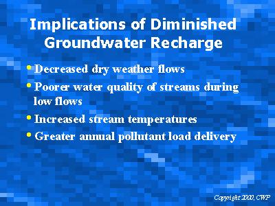 This decrease in infiltration limits groundwater recharge, which can lead to decreased baseflow, an increase in stream temperature, and a higher level of pollutants in the stream.