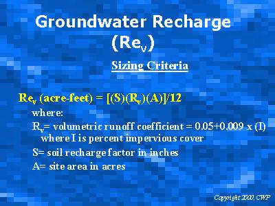 The groundwater recharge volume is calculated using the volumetric runoff coefficient, soil recharge factor, and the site area. Alternatively, the soil recharge factor can be expressed as a fraction of the water quality volume on a site.