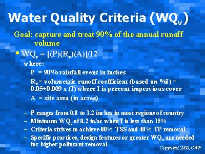 The goal of the water quality criteria is to capture and treat 90% of the average annual stormwater runoff volume. This is equivalent to the 90th percentile rainfall multiplied by the volumetric runoff coefficient and site area. This criteria strives to achieve 80% TSS removal and 40% TP removal on an annual basis (assuming appropriate treatment practices are used and constructed, designed, and maintained correctly). Higher removal rates can be obtained using a greater water quality volume or specific design features.