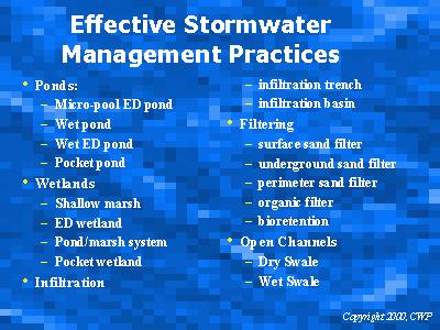 There are 5 groups of structural stormwater management practices that can be used to meet the water quality volume criteria and the target removals of 80% for TSS and 40% for total phosphorus: ponds, wetlands, infiltration, filtering, and open channels. Some other practices may meet a portion of this volume, such as grass channels. For a more detailed discussion of SMP options, consult the �Review of Stormwater Treatment Practices� slide show.