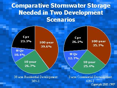 These charts depict the percentage of stormwater storage needed for the four major (i.e., largest volume requirements) criteria in two development scenarios with different impervious cover levels. More storage is required for channel protection and water quality in the watershed with higher impervious cover. Storage volumes were calculated based on the proposed criteria presented in this slide show.