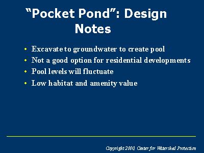 Listed here are some key design notes for pocket ponds. Pocket ponds do not necessarily provide the same benefits as larger ponds. Because of fluctuating pool levels, wet ground adjacent to the pond may provide a breeding ground for mosquitos.