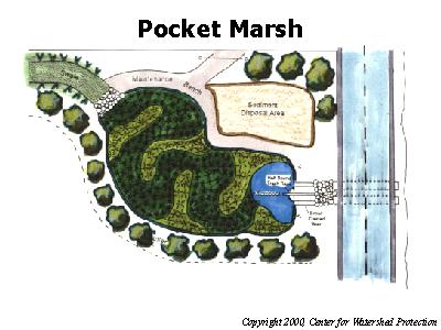 The pocket marsh design is very similar to the pocket pond. In this design, the bottom of the wetland intercepts the groundwater, which helps to maintain the permanent pool. Some evidence suggests that groundwater flows may reduce the overall effectiveness of stormwater management practices. This option may be used when there is not significant drainage area to maintain a permanent pool.