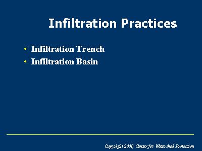 Infiltration practices are those that capture and temporarily store the water quality volume before allowing it to infiltrate into the soil over a two day period. These practices are an excellent technique for meeting the recharge requirement and may also provide stormwater detention and channel protection storage in certain limited cases. Design variations include the infiltration trench and infiltration basin.