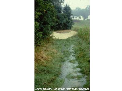 This is a photo of an infiltration trench with a swale serving as pretreatment.