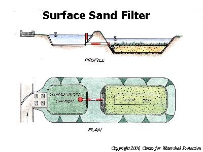 The surface sand filter is the original sand filter design. In this practice both the filter bed and the sediment chamber are above ground. The surface sand filter is generally designed as an off-line practice, where only the water quality volume is directed to the filter. The surface sand filter is the least expensive filter option, and has been the most widely used.