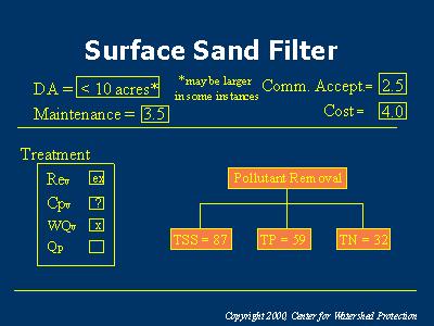 A surface sand filter has high community acceptance but also a high cost. It meets the water quality requirement and may meet the recharge requirement if it is designed to exfiltrate into the soil. A surface sand filter removes 87% of TSS, 59% of TP, and 32% of TN.