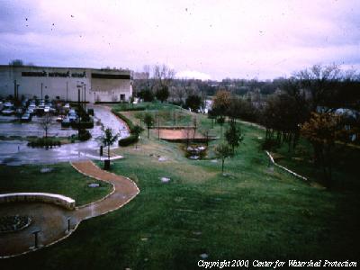 This is a photo of a surface sand filter. The filter bed is located in the background and is landscaped with trees around the perimeter.