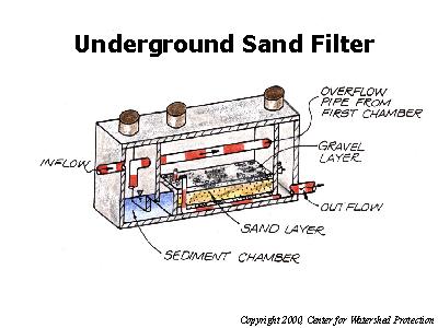 The underground sand filter is a modification of the surface sand filter, where all of the filter components are underground. Like the surface sand filter, this practice is designed to treat only the smaller water quality events. Underground sand filters are expensive to construct, but consume very little space. They are well suited to highly urbanized areas.