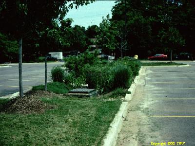 Here is a bioretention island in a parking lot. Note the curb cuts that allow runoff to flow into the vegetated depression. In addition, there is a drop inlet that allows large flows to by pass the system.