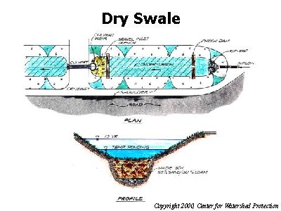 Dry swales are similar in design to bioretention areas (See Bioretention). These designs incorporate a fabricated soil bed into their design. That is, the existing soil is replaced with a sand/soil mix that meets minimum permeability requirements. An underdrain system is used under the soil bed. This system is a gravel layer which encases a perforated pipe. Stormwater treated in the soil bed flows through the bottom into the underdrain, which conveys this treated stormwater to the storm drain system. Dry swales are a relatively new design, but studies of swales with a native soil similar to the made soil bed of dry swales suggest high pollutant removal. In a dry swale the entire water quality volume is temporarily retained by checkdams during each storm. The swale is designed to rapidly dewater which makes this practice a good choice for low density residential projects or for very small impervious areas.