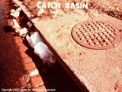 This slide shows the curb inlet portion of a catch basin, and the tendency for trash and debris to clog the inlet.