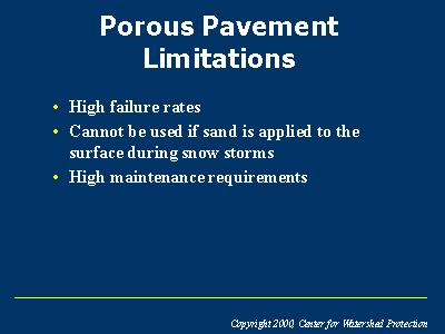 Listed here are some drawbacks of porous pavement. Some design features, such as overflow provisions and strict maintenance contracts may be able to overcome some of these drawbacks.
